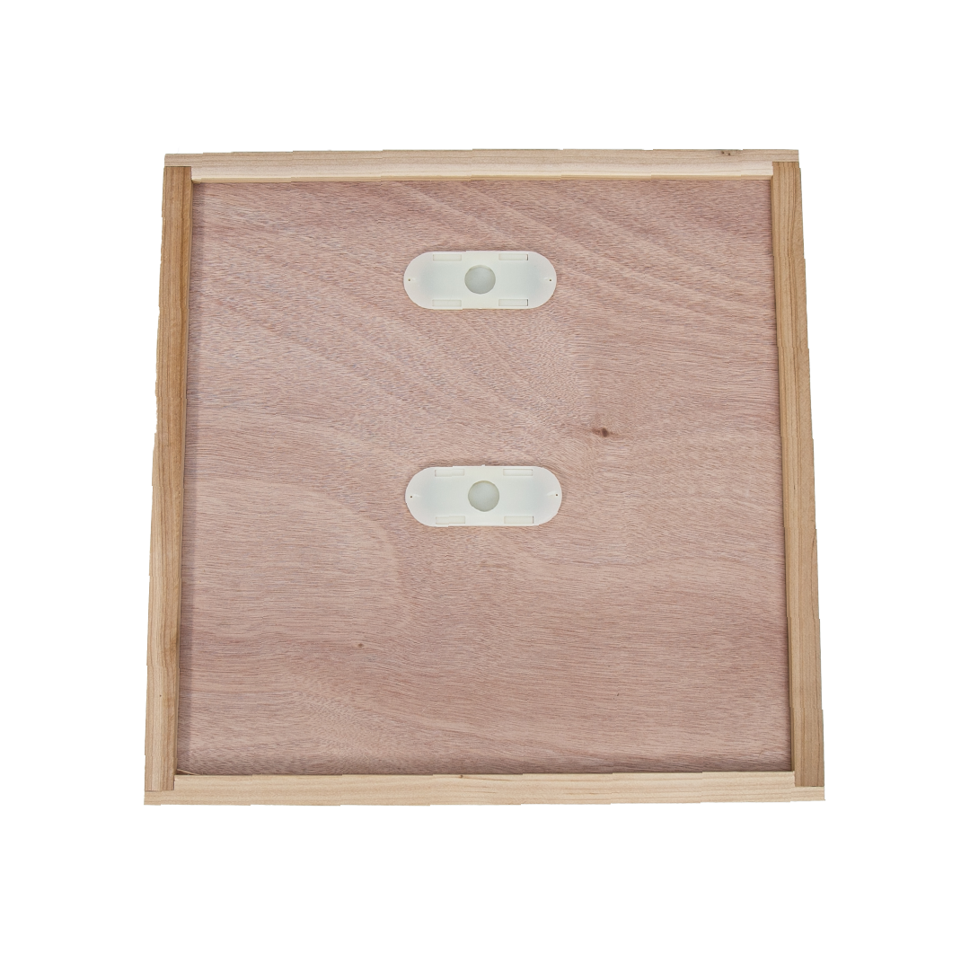 The crown board is a layer of fir wood that fits between the upper super and the hive roof. With 2 holes cut out in the wood, the crown board is handy for providing your bees with some extra food during winter or when you’re starting the hive. These holes can also be used to get a sneak peek at how your bees are doing with minimal disturbance to the colony.