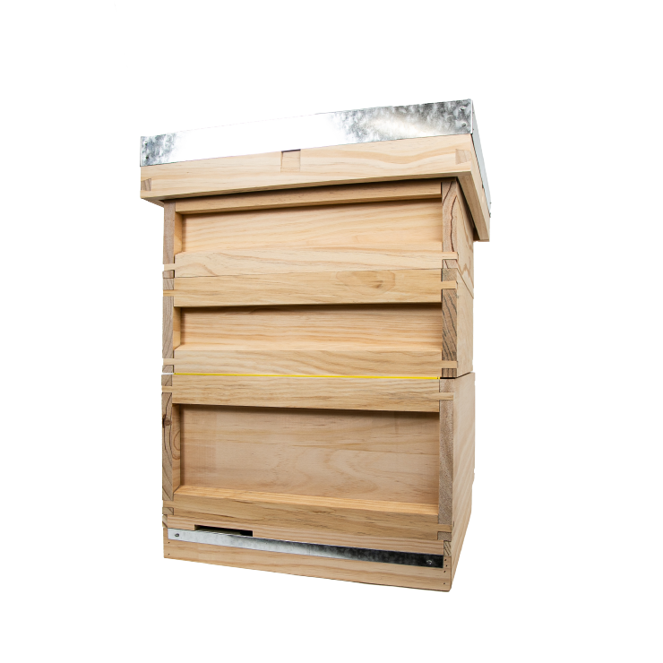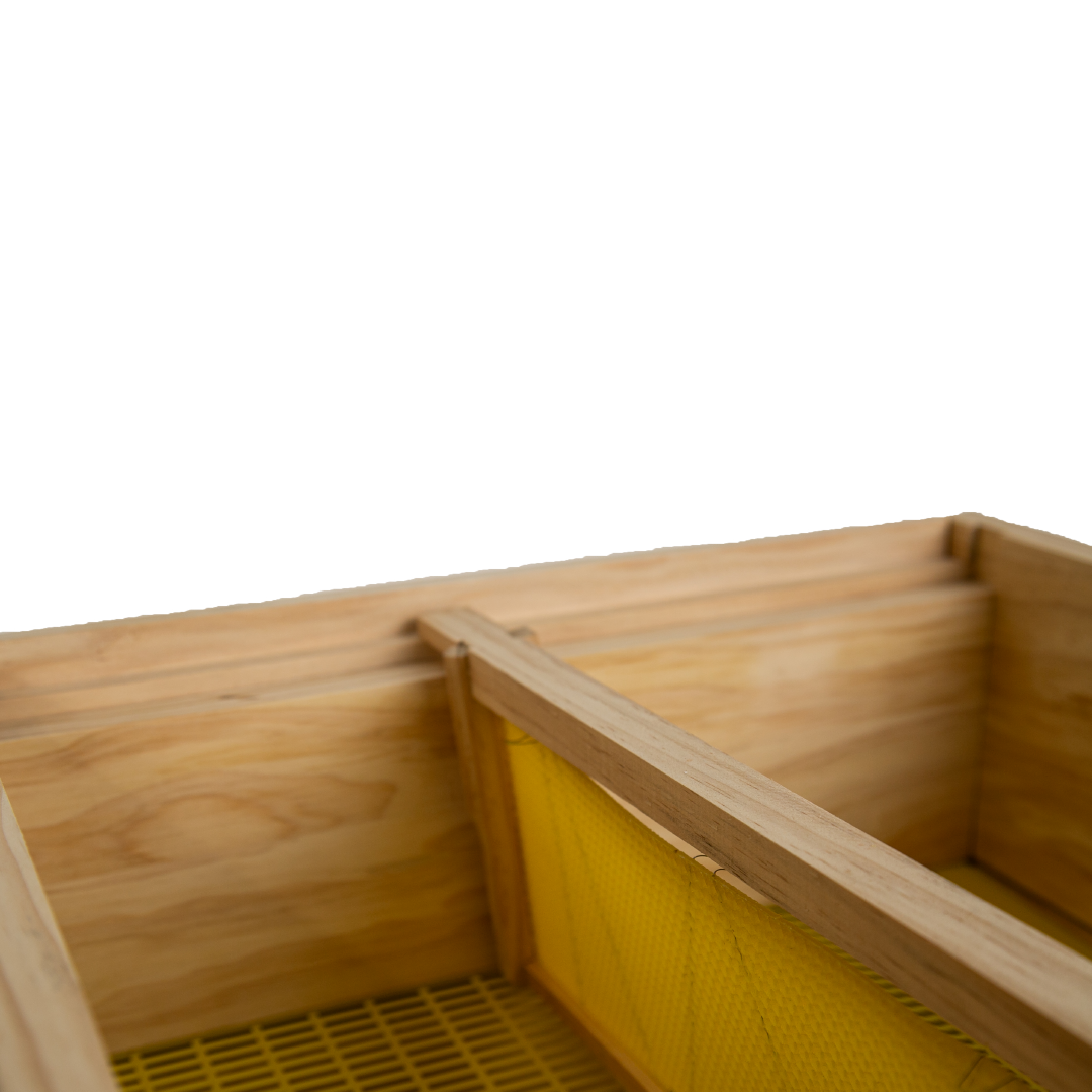 Our brood box fits 10 frames. This is the perfect amount of room for your queen bee to do her royal duty of laying eggs and growing the colony. With the queen’s eggs towards the centre of the brood box, there is plenty of room left on the outer frames for your bees to build up a honey reserve to feed themselves.